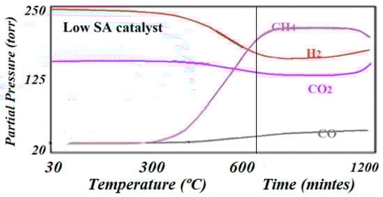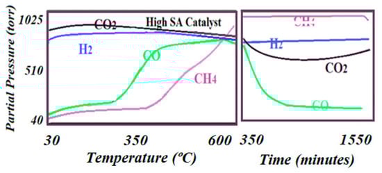 Approximately 0.5 g of the catalyst was taken for all tests and was placed in a 9 mm ID SS tubular fixed bed reactor. The catalyst was reduced with pure H2, and the temperature was ramped at a rate of 10 °C/min up to 500 °C and kept for 6 h at 20 bar. These reduction conditions were selected rather than a high reduction temperature to minimize sintering of the active species. After reduction, the reactor temperature was brought down to 30 °C prior to flowing the active gases for the reaction. A combination of 50 cm3/min of CO2 and 200 cm3/min of H2 was pre-mixed before being passed through the catalyst bed at room temperature. The pressure in the system was set to 20 bar. The reactor temperature was then raised to 600 °C at a rate of 2 °C/min and set at this temperature for 24 h. The mass spectrometer (Cirrus MKS) [43] was connected to the exhaust of the reactor and served to online monitor the signals for both the flowing mixture as well as for the expected products. This latest method allowed the step-by-step identification of the newly produced products under the reaction conditions of temperature and pressure. It was found that the catalyst that had the higher specific surface area produced a higher conversion of CO2 into CH4 and other products. Furthermore, the high specific surface area catalyst showed a longer active life and less deactivation after 24 h of testing at 20 bar than the low specific surface area catalyst (see Figure 8 and Figure 9).
