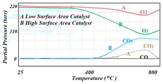 For the regeneration of the spent catalysts, the ICCS was used at the end of the reaction and upon deactivation of the catalyst to perform temperature programmed oxidation (TPO) to quantify the amount of carbon that was produced as graphite or by possible cracking (if there was any) and had covered the active surface, and hence, deactivated the catalyst. This test was completed by flowing a mixture of 10% O2 balance He through the catalyst bed at 35 °C and brought up to 500 °C at a rate of 10 °C/min. The TPO results were monitored by the mass spectrometer that was connected to the exhaust of the reactor. The TPO profiles for both spent catalysts are included in Figure 10. Profile A corresponds to the low specific surface area catalyst, while profile B corresponds to the high specific surface area catalyst. The consumption of O2 was not quantified, but it was observed that the high specific surface area catalyst showed a higher consumption of O2 which indicated that more graphite was formed during the reaction as there was little probability of cracking in these cases.