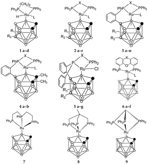 - Kaltenberg, A.A.; Zimina, A.M.; Bashilova, A.D.; Malysheva, Y.B.; Vorozhtsov, D.L.; Piskunov, A.V.; Somov, N.V.; Grishin, I.D. The peculiarities of interaction of 5,6,10-{Cl(Ph3P)2Ru}-[5,6,10-(μ-H)3-10-H-exo-nido-7,8-C2B9H8 with bis(diphenylphosphino)methane and 1,2-bis(diphenylphosphino)benzene. Russ. Chem. Bull. Int. Ed. 2014, 72, 912–924. [Google Scholar] [CrossRef]