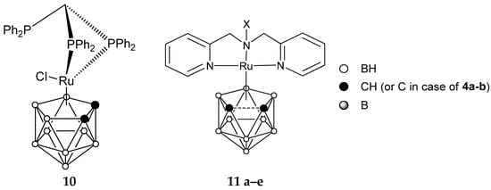 - Chizhevsky, I.T.; Lobanova, I.A.; Petrovskii, P.V.; Bregadze, V.I.; Dolgushin, F.M.; Yanovsky, A.I.; Struchkov, Y.T.; Chistyakov, A.L.; Stankevich, I.V.; Knobler, C.B.; et al. Synthesis of mixed-metal (Ru−Rh) bimetallacarboranes via exo-nido- and closo-ruthenacarboranes. Molecular structures of (η4-C8H12)Rh(μ-H)Ru(PPh3)2(η5-C2B9H11) and (CO)(PPh3)Rh(μ-H)Ru(PPh3)2(η5-C2B9H11) and their anionic closo-ruthenacarborane precursors. Organometallics 1999, 18, 726–735. [Google Scholar] [CrossRef]