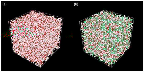 To investigate the hydration characteristics of Ca2+ and Cl− ions, equilibrium MD simulations are employed with the GROMACS package [28,29], while the RasMol [30] tool is used for the visualization and postprocessing of the recorded atomic trajectories. An electrostatically neutral cuboidal simulation box of 6 × 6 × 6 nm3 is set up to contain specified numbers of randomly distributed Ca2+, Cl− ions, and water molecules as a function of the salt concentrations, as shown in Table 1. Two representative simulation boxes at 1 and 60 wt.% CaCl2 are shown in Figure 1. The simulation domain is first equilibrated at 298.15 K and 1 atm. pressure under the isothermal–isobaric (NPT) ensemble for 5 nanoseconds (ns) under the V-rescale thermostat and Berendsen barostat with coupling time constants of 2 picoseconds (ps). Next, the canonical (NVT) simulation is performed at the same temperature for 10 ns as the production run. For concentrations of 50, 55, and 60 wt.%, an additional 25 ns is implemented to account for their extended ion-pairing time. The temperature is restrained by the Nose–Hoover thermostat [31] with a time constant of 2 ps to control the period of the temperature oscillations at equilibrium. All simulations are independently repeated three times, using a timestep of 0.001 ps and the leap-frog integrator.