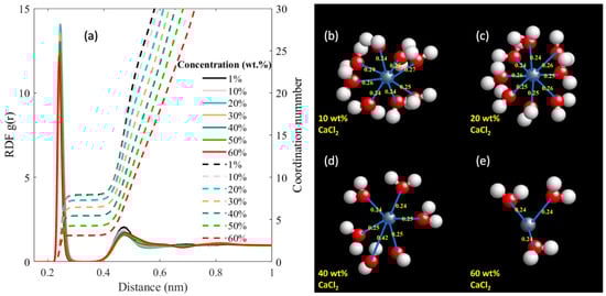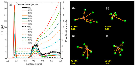 (a) The radial distribution function (RDF) presented as continuous lines, and the corresponding coordination number (CN), shown with dashed lines, for Ca2+ and Cl− at different salt concentrations. Representative orientations for the Cl− ions around a Ca2+ ion for (b) 10 wt.%, (c) 20 wt.%, (d) 40 wt.%, and (e) 60 wt.% CaCl2 concentrated solutions are illustrated, with distances in nm (nanometers). The orange arrow labels the typical distance between a Cl− ion and a Ca2+ ion corresponding to the peak RDF in (a) denoting the first shell.
