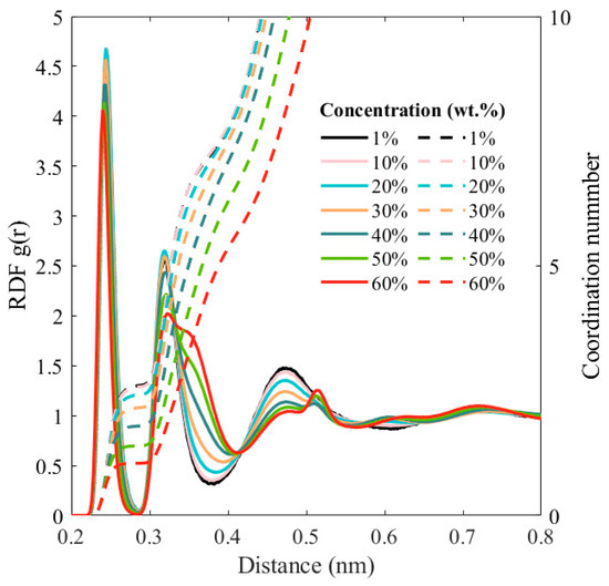 We examine the coordination behavior for the hydrated ions in the salt solutions with concentrations ranging from 1 to 60 wt.% of CaCl2. Figure 2 illustrates the variations in the radial distribution functions (RDFs), g(r), for Ca2+–water and the corresponding coordination numbers (CNs) of water molecules surrounding a Ca2+ ion in the aqueous solution. We note that the RDF and CN are calculated based on the oxygen (OW) of the water molecule. The RDF [28] is computed as , where the < > represents the average, and is the mean particle density of atom B at a radial distance r from atom A, while is the same physical quantity but considered over all such spheres around A, with a maximum extent being half of the simulation domain dimension. The CN indicates the number of water molecules present in each neighboring spherical shell, and obtained through the integration of the RDF [28], i.e., .