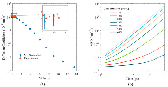 Figure 7 presents the variations of the self-diffusion coefficients of the ions and the water molecules in the solution for different salt concentrations. The predictions from the MD simulations are calculated using the Einstein relation where t, r, and DA, represent time, atom position, and the self-diffusion coefficient [41]. These simulation outcomes are in agreement with the previously published experimental data at dilute concentrations [42]. As the concentration increases, the ion pairs form, impeding the diffusion, and corroborating the solubility behavior [10,43]. The molality above which the ions become significantly sluggish and precipitate corresponds to the findings in Figure 6 from the variations of the CN with increasing salt concentrations, thereby validating our prediction of the solubility limit.