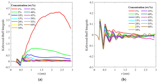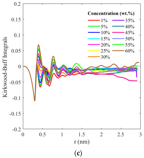 The Kirkwood–Buff integrals (KBIs) for the ion–ion and ion–water interactions derived from the spatial integral over the corresponding radial distribution functions are presented in Figure 9. These are calculated as , where is the KBI for a pair of components i and j, which could be ions or water molecules, and is the RDF between particles i and j at a distance R. The RDF is subtracted by 1 to remove the ideal gas contribution, as the KBI is intended to describe deviations from the ideal gas behavior. At low concentrations (1–10%), due to the complete dissolution of the salt, and, consequently, the absence of ion pairs in the dilute solution, KBIs for the ion–ion interactions do not converge; however, we note that for increasing concentrations, the KBIs (Figure 9a) attain a plateau around 1.5 nm, indicating the mean size of the structural configurations of the ion pairs attained in concentrated solutions. Conversely, the KBIs for ion–water interactions presented in Figure 9b,d exhibit a reciprocal behavior; at low concentrations, the presence of hydration shells creates defined structural configurations that converge around 1.5 nm, while at higher concentrations (>40%), the formation of ion pairs disrupts the hydration shells and diverges from the aforementioned structural order.