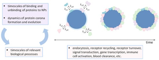 It must be realized that a static or equilibrium-based description of NP–protein interactions, which focuses on parameters such as equilibrium binding affinity (KD) and corona composition, is insufficient to understand NP biobehavior in vivo. This is because the open in vivo system is a nonequilibrium state, where concentrations are in constant change and biological processes are dynamically regulated [,,]. To illustrate, the rate constants governing binding and unbinding between proteins and NPs, along with the concentrations involved, exert a direct influence on the rate of protein adsorption and corona formation. Simultaneously, the rate constant of complex dissociation dictates the residence time of the bound protein on the NP surface. In this way, it becomes essential to consider the timeframes of both binding and unbinding events in relation to the timescales of relevant biological processes in order to gain a comprehensive understanding of how NPs impact biological function (Figure 1) [,,,,,].