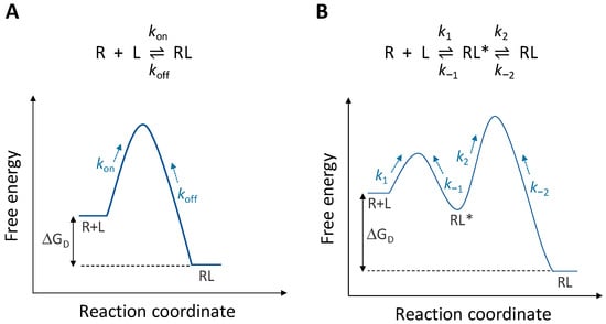Free energy profiles characteristic of (A) one-step and (B) two-step binding reactions between receptor (R) and ligand (L) proteins. The free energy of binding is indicated by ΔGD. See text for additional details.