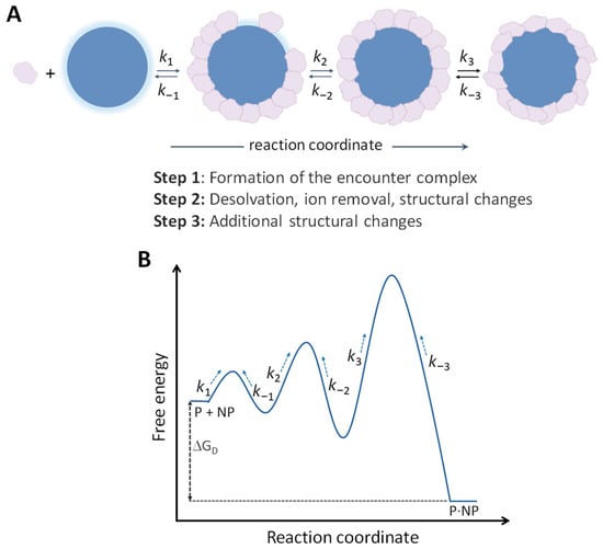 It is instructive to consider NP–protein interactions in analogy to the kinetic mechanism of protein–protein complexation, as described in Section 3 (Figure 2). However, this analogy assumes only direct NP–protein interactions and neglects the occurrence of interprotein interactions and other secondary phenomena. Accordingly, NPs and proteins undergo random collisions in a solution until they bind in the proper orientation, forming a first-encounter complex with a second-order rate constant, k1. The magnitude of k1 is expected to approach the Smoluchowski diffusion limit, that is, k1 ≈ 108–109 M−1 s−1, depending on NP size. This is primary because NPs are considered spherical and uniform, which means that formation of the proper binding interface depends only on the orientational constraint imposed by the protein itself []. The encounter complex can undergo partial desolvation of polar groups and interfacial restructuring (local protein structural changes) characterized by the first-order rate constants k2, k3, and so on along the reaction pathway. The energy barriers associated with these processes slow down the overall association reaction. Simultaneously, the tightening steps of desolvation and interfacial restructuring collectively lower the free energy of the system toward a more stable final state. The final complex can be stabilized by a combination of van der Waals forces, hydrogen bonds, electrostatic interactions, and hydrophobic effects, with the relative importance of each interaction depending on the specific NP and protein characteristics [].