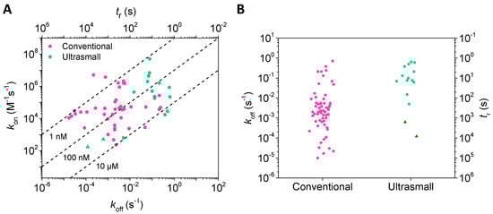 Compilation of NP–protein interaction kinetics data. (A) kon and koff rate constants for both large and ultrasmall NPs. Dashed lines delineate distinct KD values in the kon–koff plot. (B) Compilation of koff rate constants and corresponding tr values for large and ultrasmall NPs, including studies with koff data only. Dark green triangles refer to interactions between functional usGNPs and their target receptor (see text for details). Specific values of the rate constants are provided in Supplementary Tables S1 and S2.