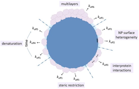 Secondary phenomena, including interprotein interactions and steric effects, add complexity to the adsorption process. For example, proteins that arrive late at the NP surface encounter limited available area for adsorption. Consequently, there may be a significant reduction in the value of k1 and, by extension, in the overall kon rate constant. Furthermore, these proteins have restricted space to spread out and form strong bonds with the NP surface, which may result in reversible adsorption [].