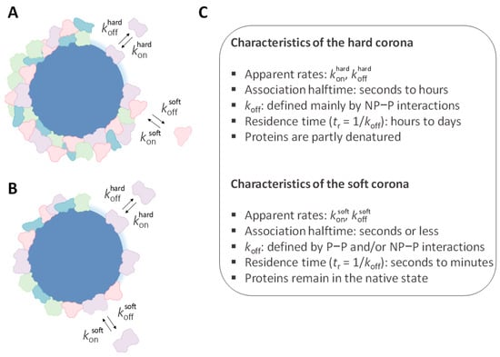 Typically, the adsorbed corona is categorized as either ‘hard’ or ‘soft’, reflecting proteins either firmly or transiently bound to the NP surface [,,,]. Additional characteristics of hard and soft coronas are illustrated in Figure 7. From a practical standpoint, proteins that remain attached to the NP surface during centrifugation and washing constitute the hard corona, whereas those proteins that are loosely bound and can be removed during these procedures are identified as part of the soft corona. In a more quantitative approach, the protein corona can be globally characterized in terms of a distribution of apparent koff and tr values, as illustrated below.