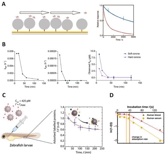 In 2007, Cedervall et al. published a landmark study, which explicitly introduced the concept of the protein corona []. In their work, the authors employed SPR spectroscopy to monitor the overall dissociation of plasma proteins from the surface of copolymer NPs (Figure 8A). The obtained data were best fitted assuming two independent dissociation processes, representing ‘weakly’ and ‘strongly’ associated proteins (Supplementary Table S3). More recently, Stordy et al. employed biolayer interferometry to investigate the dissociation of plasma proteins from the surface of gold and liposome NPs []. The dissociation kinetics were also modeled assuming independent weak and strong binding modes. Interestingly, the study explicitly investigated the influence of incubation time (from 10 to 120 min) on the apparent koff values. For gold NPs, the dissociation rates decreased as a function of incubation time until approximately 40 min, beyond which the rates stabilized (Figure 8B and Supplementary Table S3). Specifically, for strongly associated proteins, the koff rate constant decreased from 1.8 × 10−4 to ~10−7 s−1. In other words, it took about 40 min for a truly ‘irreversible’ protein corona to form on the surface of the gold NPs. For weakly associated proteins in turn, the koff rate constant reduced to 3.4 × 10−4 s−1 after 120 min of incubation, resulting in an average tr of 0.8 h. For liposomes, the trends were similar, except the dissociation rates took much longer to stabilize (Supplementary Table S3).