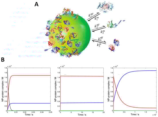 Mathematical modeling of protein corona formation process. (A) Schematics of protein corona formation. Proteins of type i attach to the NP surface with association and dissociation rate constants of ki,on and ki,off. On average, a maximum number of ni proteins of type i can occupy the NP surface. (B) Results from numerical simulations illustrating the time evolution of corona formation on copolymer NPs. HSA (red), HDL (blue), and fibrinogen (green) were used as model proteins in the simulations. Left and middle panels capture the first 0.05 and 20 s of simulation, respectively, while right panel depicts 20,000 s of simulation where a stable equilibrium has been reached. Reprinted with permission from ref. [] (A) and ref. [] (B).