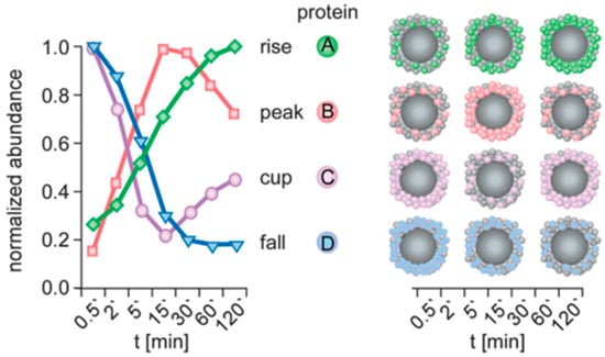 Temporal evolution of corona proteins on NPs. Four distinct protein groups were identified based on their time-dependent abundances. Reprinted with permission from ref. [].