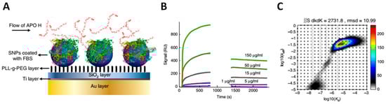 The hard protein corona of NPs has received significant attention in research, while the soft corona remains comparatively less understood. To address this gap, new technological advances have recently emerged to analyze the soft corona [,,,,]. On the one hand, techniques have been devised to separate and identify the proteins comprising the soft corona of NPs within complex biofluids [,,,]. However, there is still a need to better understand the kinetics governing the formation and dissociation of the soft corona. A recent study by Mohammad-Beigi et al. contributed valuable insights into this aspect []. First, these authors identified apolipoprotein H (ApoH) as a major component of the soft corona on silica NPs. Using SPR spectroscopy, they were further able to measure the apparent KD, kon, and koff for ApoH binding to a preformed FBS hard corona (Figure 11). The results yielded an apparent KD of 17 μM and a koff of 0.048 s−1, corresponding to an ApoH residence time of 21 s on the hard corona. Despite these latest advances, additional work is needed to characterize the composition, architecture, and dynamics of the soft corona, as well as its biological significance.