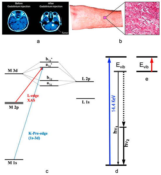(a) The illustrative MRI images without (left) vs. with a contrast agent (right); (b) the skin surface and its microscopic profile of NFS; (c) illustrative K- and L-edge X-ray absorption spectroscopy (XAS) transitions and the associated energy levels; (d) nuclear resonant vibrational spectroscopy (NRVS) transitions which measure the vibrations indirectly but with many advantages; (e) infrared absorption spectroscopy (IR), which measures vibrations directly.