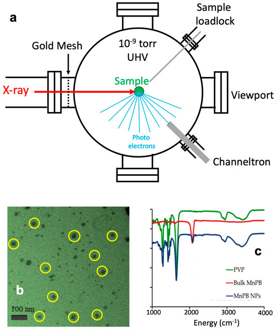 (a) A schematic drawing for 3d metal L-edge X-ray absorption spectroscopy (L XAS) measurement apparatus under ultrahigh vacuum (UHV); (b) a TEM image of the main sample—polyvinylpyrrolidone (PVP)-coated K2Mn[Fe(CN)6] nanoparticles (PVP-coated Mn-PB NPs for short). The yellow circles are used as an eye-guide; (c) IR spectra for PVP (green), bulk Mn-PB (red) and PVP-coated Mn-PB NPs (blue).