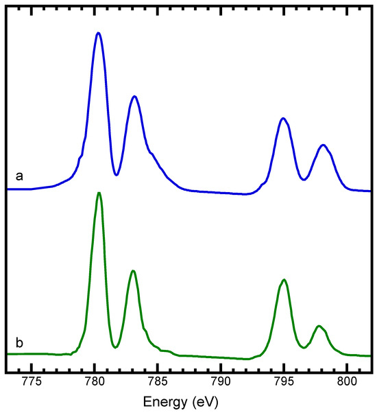 K2Mn[Fe(CN)6] was prepared by introducing a Mn(II) source (i.e., MnCl2) into K4Fe(CN)6 to form a PB analog compound (SI) [19,20]. According to L XAS (Figure 3a vs. Figure 3b, Figures S2 and S3), Mn is found to be in the N-bound position in PB. In an “opposite” approach, a 57Fe(II) source (i.e., 57FeCl2) was complexed into the [Co(CN)6]3− ion to form an alternative PB analog compound of K57Fe[Co(CN)6] where Co should remain in the C-bound position in the [Co(CN)6]3− ion. Therefore, Co vs. Mn L XAS can provide a meaningful comparison insight into the two different cases. For this purpose, Figure 4 shows the Co L XAS for the comparison samples K57Fe[Co(CN)6] (Figure 4a) and the reference sample K3[Co(CN)6] (Figure 4b).