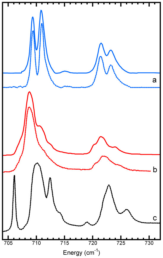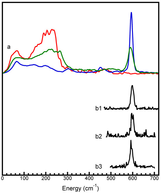 Since K2Mn[Fe(CN)6] is not 57Fe labelled, its NRVS thus has a very weak signal (2% 57Fe in the natural abundance samples vs. 100% 57Fe in the enriched samples). Therefore, measuring a full NRVS scan is out of the question. We instead only scanned a narrow region around the nuclear resonant peak at Evib = 0 (±40 cm−1) and that around the sharp peak at ~594 cm−1 (e.g., 380–700 cm−1—the presentation range here is a bit less) [22,28]. Although the exact peak position for this sharp peak cannot be precisely located due to the skip-scan operation (jumping from the nuclear resonant peak region to the targeted sharp peak region) [22,28], the obtained peak feature is sharp and clear. The energy positions are less than ±1 meV from the peak position at 594 cm−1 (Figure 6b1–b3 vs. Figure 6a), while the skip-scan uncertainty can be as large as 1.5 meV. This indicates the presence of a C-bound ls-Fe(II) in [Fe(CN)6]4−, confirming the assignment based on the L-edge XAS measurements. This shows that a C-bound ls-Fe(II) is true for the bulk of the sample of K2Mn[Fe(CN)6], not just on its surface (L XAS).