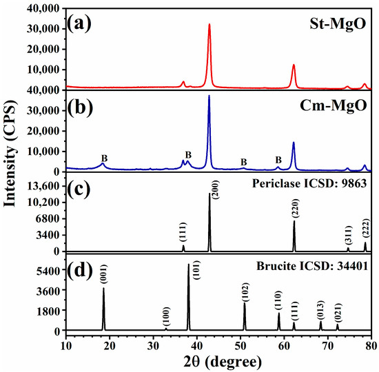 X-ray diffraction (XRD) of the MgO samples St-MgO (a); Cm-MgO (b); and the identification patterns of the periclase (c) and brucite (d) phases. For sample Cm-MgO (b), the brucite phase represented by “B” was also identified.