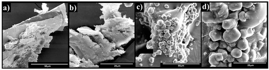 The SEM images of the synthesized St-MgO oxide (Figure 2c,d) show rounded particles with undefined pseudo-spheres. The morphology of St-MgO is due to the gelatinization method of the colloidal starch suspension, which acts as a fuel and requires a lower calcination temperature compared to other traditional syntheses, influencing the porosity and agglomeration of the particles [18,25].