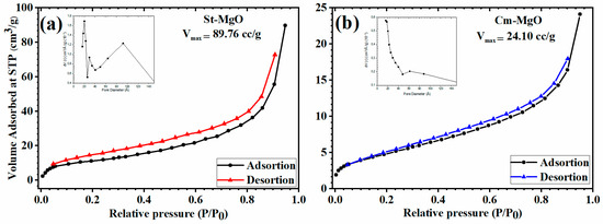For the St-MgO sample (Figure 3a), a hysteresis loop of the H4 type was observed by isotherm analysis, typical of materials with narrow spaces between particles, with N2 gas thus filling the pores [26,27]. For the commercial magnesium oxide (Figure 3b), the hysteresis loop is interpreted as type H3 for aggregates of overlapping particles forming plates, corroborating the SEM micrographs [28]. The curves show that the volume of gas adsorbed (Vmax) by the St-MgO sample was 3.72× greater than that for the Cm-MgO sample. This may be associated with the lower calcination temperature and the influence of the starch, resulting in a more porous material with a larger surface area.