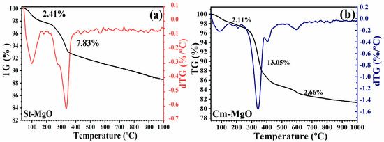 Thermal analysis curve (TGA/dTG) of the samples St-MgO (a) and Cm-MgO (b). TGA curves of samples were obtained by scanning from 30° to 1000 °C in synthetic air with a flow rate of 20 mL⋅min−1 and a heating rate of 10 °C/min.