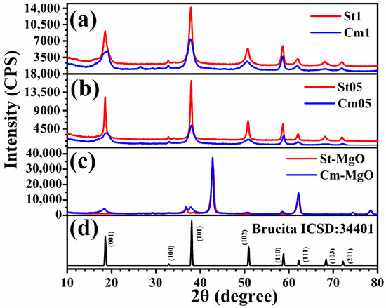 XRD diffractograms of MgO-based samples with cassava starch and commercial samples at different concentrations St1 and Cm1 (a), St05 and Cm05 (b). Also presents the data of MgO before the removal of Cr ions (c) and the identification patterns of the brucite (ICSD: 34401) phase (d).