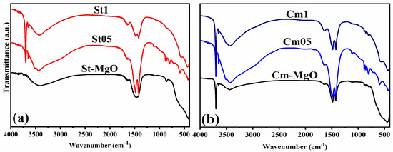 FTIR spectra of St-MgO (a) and Cm-MgO (b) samples before and after Cr3+ removal.