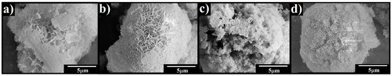 Figure 7 shows the SEM images of the MgO samples. The St1 (Figure 7a) and Cm1 samples (Figure 7b), after the insertion of chromium ions, showed nano-leaf morphologies, due to the change in structure from periclase to brucite [47]. For the sample St05 (Figure 7c), in addition to the lamellae, there is also the aggregation of the particles and the formation of a rough, irregular surface. For sample Cm05 (Figure 7d), no significant change in morphology was observed.