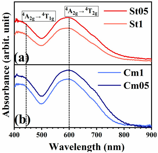 Chromium(III) ions are known to preferentially occupy octahedral sites forming the two bands observed (Figure 8a,b), reflecting the greater stabilization at these sites, and the color of pigments and position of the absorption bands depend on the ligand’s field strength [50]. For all the samples, the characteristic absorption bands located at approximately 440 nm and 600 nm were observed for both the starch-based MgO pigments (St1 and St05) represented in Figure 8a and the commercial MgO-based pigments (Cm1 and Cm05) represented in Figure 8b, characteristic of Cr(III) ions attributed to the allowed cubic d–d octahedral spin transitions: 4A2g(F) → 4T1g(F) and 4A2g(F) → 4T2g(F), respectively, present for all samples [51,52].