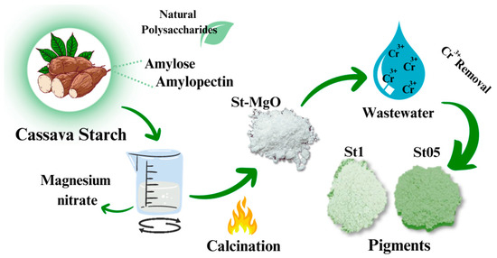 This work aimed to synthesize magnesium oxide (MgO), a single solid with a high ionic character and a crystalline phase known as periclase, stoichiometry, and crystalline structure of a face-centered cubic type and high thermal resistance [11]. The synthesis was carried out using the colloidal method in a reaction medium with starch extracted from cassava (Manihot esculenta), a tuber native to Brazil with a high energy value, which can be used as a precursor for synthesis [12]. Starch is a biodegradable polysaccharide consisting of amylose and amylopectin molecules made up of D-glucose units [13]. Natural polysaccharides act as low-cost, non-toxic alternative additives produced from plants, acting as complexing agents for central metal ions, and can adapt to the growth of MgO [14]. Several other studies have shown the advantages of opting for biosynthesis and green fabrication using natural fuels, e.g., Naveed et al. 2023 [15] in their studies using aqueous extract of Nigella sativa seeds in the synthesis of zero-valent iron nanoparticles (ZVI-NPs) and evaluation of their heavy metal remediation capabilities. Thus, a synthesized oxide and commercial oxide were used as a comparison for the removal of Cr3+ ions from synthetic wastewater. The removal of chromium by MgO occurs through the coordination of contaminant ions on the surface of the magnesium oxide, resulting in an interaction between the active sites of the oxide and the chromium ions [16,17]. After removing the contaminant, the materials obtained a color characteristic of the Cr3+ ion. They were then characterized and applied as pigments for colorless real estate paint, showing stability of color and structure. The steps involving the methodology for preparing and applying magnesium oxide (MgO) are shown in Scheme 1.