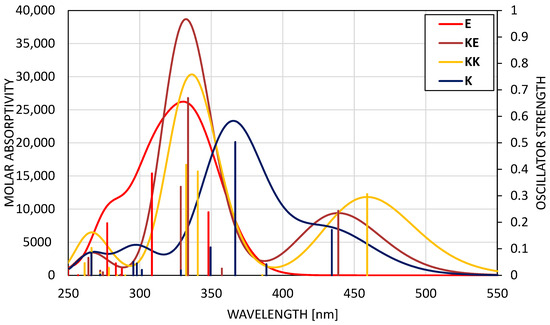 where n is the number of the transitions taken into account, is the predicted position of the band of the ith transition in nm and is the calculated maximal intensity of the ith band according to Equation (2) from the oscillator strength [105].