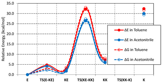 Since, in the region around 380 nm, both E and KE are absorbing, the excitation in this region leads to an emission at 530 nm, attributed to the existing KE, and to an emission at 442 nm (missing in toluene), which probably comes from the enol form, where the tautomeric OH group is engaged in intermolecular hydrogen bonding with the solvent. From the existing data, it is impossible to make a conclusion as to whether the intramolecular O-H…N bonding is completely or partially broken by the solvent. As seen from Figure 4, upon irradiation with an external light source, substantial spectral changes are observed, associated with a rise in the emission at 440 nm. Basically, the irradiation can lead to two processes, as shown in Figure 3—trans/cis isomerization to Ecis or switching—leading to the accumulation of KK. The latter process should be more probable in toluene, where switching relaxation back from KK to KE through TS(KE-KK) is expected to be slower. The ground-state twisting transition state is very polar, and its energy decreases from 32 kcal/mol in toluene (Table S1) to 26 kcal/mol in ethanol, considered as an implicit solvent. The real stabilization is probably higher because of the increased possibilities for specific solute–solvent interactions in the transition state, in which the NH proton does not participate in intramolecular hydrogen bonding. It is much more probable to assume trans to cis isomerization with the accumulation of some amounts of Ecis. This form (as seen from Figure S2) is blue shifted compared to E, and the intramolecular hydrogen bonding is broken, which allows additional stabilization by the solvent. The relaxation back to E proceeds through the inversion transition state (as predicted by the theoretical calculations, Figure 3), in which energy does not depend on the solvent polarity. The process of cis/trans isomerization has been already described in structural analogues of 6 by Traven and co-authors [110,111]. A very recent study by Tang and co-workers describes the breakage of the CO-O bond in alcohols under strong external irradiation [112] in 4. The same process is theoretically predicted by Krauter at al [71], which creates an additional possibility in the interpretation of the data from Figure 4.