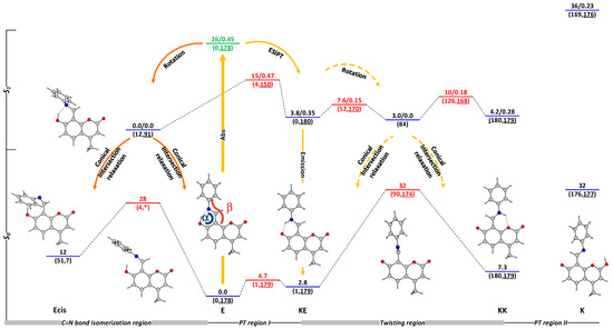 In Figure 3, the ground- and first excited-state potential energy surfaces are sketched. According to these, and also to the general understanding of long-range PT in similar compounds [41], the excitation of the enol form through an energetically high Franck–Condon state could lead either spontaneously to conical intersection (CI) relaxation in the C=N bond isomerization region, yielding a mixture of ground-state E and Ecis, or ballistically, through ESIPT, to KE*. Then, the excited KE* can emit or, by twisting around the C-C bond (the axle in Scheme 2), can reach the twisting conical intersection region, relaxing as a mixture of KE and KK. As shown above, KE almost immediately restores to the predominant E, while KK can be accumulated due to the large relaxation barrier back (~25 kcal/mol in respect of KK). Only in such a consequence of events could an emission from KK be observed. Bearing in mind that no spectral changes are observed upon irradiation, the accumulation of KK is less probable to be assumed. Therefore, the observed red-shifted emission could be only attributed to KE*. The large Stokes shift of this emission probably comes from the substantial stabilization of KE* in respect of the enolic Franck–Condon state, as seen from the figure. Schiff base 8 also exhibits an ESIPT emission in toluene around 490 nm with a Stokes shift of 7400 cm−1 [68], which comes from it being lower in energy, compared to here, in the Franck–Condon state. An emission in cyclohexane around 480 nm, attributed to the ESIPT process [109], is measured for 7, but there are no theoretical data to make a more detailed interpretation.