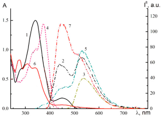 Absorption spectrum (1), fluorescence spectra at λex = 332 (5), 375 nm (2, 7), and 461 nm (3), and fluorescence excitation spectrum at λreg = 461 nm (4) before (1–5) and after (6, 7) UV irradiation with the external source of high intensity of compound (4) in ethanol. Reproduced from [82] with permission from the Springer Nature BV.