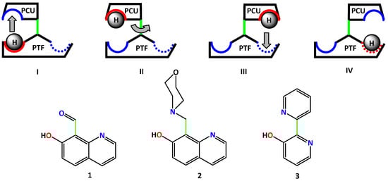 7-hydroxy-quinoline is one of the most frequently studied examples for long-range intramolecular proton transfer [51,52,53,54,55,56,57,58,59,60,61] and is a very suitable structure for PTF, where the proton donor OH group and the proton acceptor N atom are far apart to provide conditions for truly intramolecular proton exchange. The enol tautomer is substantially more stable, while the NH tautomer has been experimentally observed only in protic organic solvents or in the presence of water and results from the intermolecular, solvent-assisted PT mechanism [43,61]. Previous computational studies suggested that the reversible long-range PT process could be observed for a series of 7-hydroxy-quinoline-based switches and oxazine [41,62] and other six-membered ring heterocycles [62], pyridines [62,63,64], the carbaldehyde group [43], and CO-BF2 [65,66] as proton cranes units. Recently, we have reported several classes of proton cranes, where the azomethine group plays the role of a PCU, providing intramolecular PT to III, and in limited cases to IV, upon irradiation [67,68].