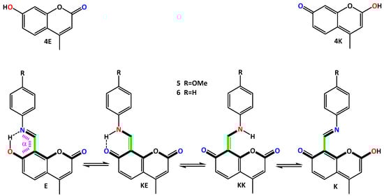 Enol (4E) and keto (4K) tautomers of 7-hydroxy-4-methylcoumarin (up). Possible tautomeric forms and mechanism for intramolecular long-range PT in the Schiff bases, discussed in the current study (down). The skeleton important for the switching is given in bold lines. The twisting angle a is indicated in magenta.