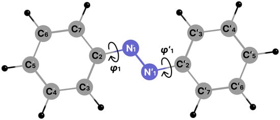 The current consensus is that E-AB (Figure 1) is characterized by a flat structure. However, the planarity of the E-AB structure has been the subject of controversial studies. There were several articles [14,15] describing azobenzene as a distorted molecule and many more modern works [16,17,18,19,20,21,22] proving the planar structure of the E-AB molecule. At the same time, in the crystalline state and in solutions, these molecules can undergo significant distortions [23,24,25,26,27]. It should be noted that structures in the solid and liquid phases are usually distorted due to intermolecular interactions. Structures determined by the gas electron diffraction (GED) method do not suffer from these interactions and reflect the properties of a free molecule. The first interpretation of the results of the GED experiment for AB was carried out in 1977 by Traetteberg and coworkers [28]. According to their interpretation, the molecule E-AB in the gas phase is nonplanar and phenyl groups twisted about φ ≈ 30°. Also, the authors of ref. [28] suggested that there are two conformers of Ci and C2 symmetries corresponding to phenyl rings rotated in the opposite and in the same direction, respectively. Vibrations corresponding to rotations of phenyl rings (Au and Bg irreducible representations under C2h point group) have frequencies of 15–21 and 95–111 cm−1 [19,20]. Potential energy surface (PES) of E-AB is shallow along the N=N-C-C torsional coordinates [19]. Studying the consequences of conformations in diffraction, the authors of ref. [29] came to the conclusion that for trans-stilbene (an E-AB-like molecule) and other molecules with flat PES, the pseudoconformer approach must be used to properly describe the diffraction pattern. In 2001, Konaka and coworkers [30] repeated the GED experiment for E-AB and interpreted their results within the framework of a dynamic model constructed using pseudoconformers: the stable form of E-AB was found to be planar. In that structural analysis, data from MP2/6-31+G* calculations were used, according to which the minimum on the PES corresponds to a distorted structure. Apparently, it is an artifact resulting from the use of a deficient ab initio approach [19,29].