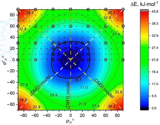 PES obtained at the B3LYP-D3/pcseg-2 level of theory as a function of rotations of two phenyl moieties around N-C bonds. Bold line RT corresponds to the temperature of GED experiment (Texp = 407 K) [30]. The points correspond to the structures taken into account in the 2D pseudoconformer model. Circles mark structures for which harmonic frequencies were calculated for subsequent evaluation of vibrational amplitudes and corrections for 2D pseudoconformer model analysis. The dashed lines indicate geometries on the PES that are actually described by the structural analyses using dynamic models.