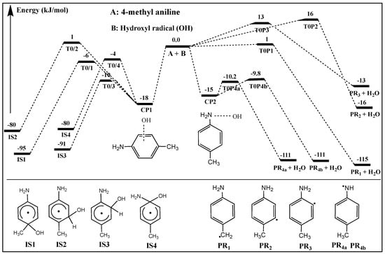 The addition of OH to the 4-methyl aniline can occur in four directions, as displayed in Figure 1. Among these, the addition of OH to the C-NH2 carbon atom creates the adduct IS1 and the other additions to the locations of C2, C3, and C4 generate the respective adducts, namely, IS2, IS3, and IS4. It can be seen from the PES that, at the first step, four addition paths proceed via the well CP1. From the well CP1, the adduct IS1 is formed when the reaction path climbs over the T0/1 transition state. At the location of T0/1, the OH moiety attacks the C1 atom at a distance of 2.1 Å, where the C1-OH bond vibrates with a negative frequency of 961i cm−1 (see Table S3). Similarly, the adduct IS2 is produced when the reaction path overcomes the hilltop T0/2. It is evident that this transition state represents the highest point when compared to other addition-based transition states like T0/1, T0/3, and T0/4. At the location T0/2, the forming bond C2-OH is about 2 Å, which is the same as the C4-OH bond at the point T0/4. However, the negative frequency of the state T0/2 is higher than that of the T0/4 (439i versus 398i cm−1); thus, the C2-OH bond vibrates stronger than the C4-OH bond. In contrast to the IS2, the adduct IS3 can be formed more easily because the hilltop T0/3 of this reaction path is the lowest compared to T0/1, T0/2, and T0/4 (see Figure 1). The forming bond C3-OH of T0/3 vibrates weaker than the bonds C1-OH, C2-OH, and C4-OH due to its longer bond length and smaller negative frequency (~2.2 Å and ~262i cm−1, respectively). The levels of the four adducts depicted on the PES indicate their high stability under typical conditions. While these adducts could potentially contribute to the formation of the final products PR2 or PR3, the reaction pathways involve exceptionally high transition states, which were not included in this investigation.