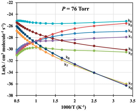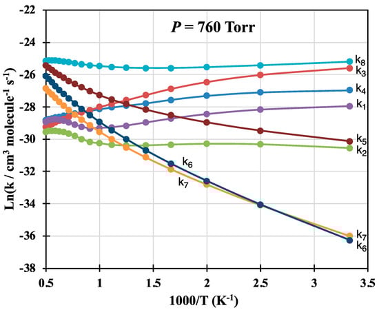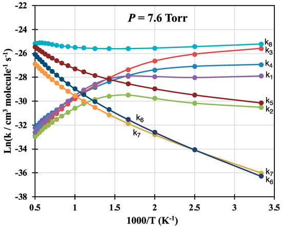 In this part, the TST model was used to compute k1, k2, and k3, whereas the RRKM model was utilized to calculate the remaining rate coefficients k4–k8. The wide intervals of temperature (from 300 to 2000 K) and pressure (from 1 to 7600 Torr) were considered in these calculations. The calculated results are shown in Tables S5–S10 of the Supplementary Materials file and plotted in Figure 2, Figure 3, Figure 4, Figure 5, Figure 6 and Figure 7.
