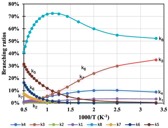 Branching ratios of the k1–k8 numbers under the given temperature range and 760 Torr pressure.
