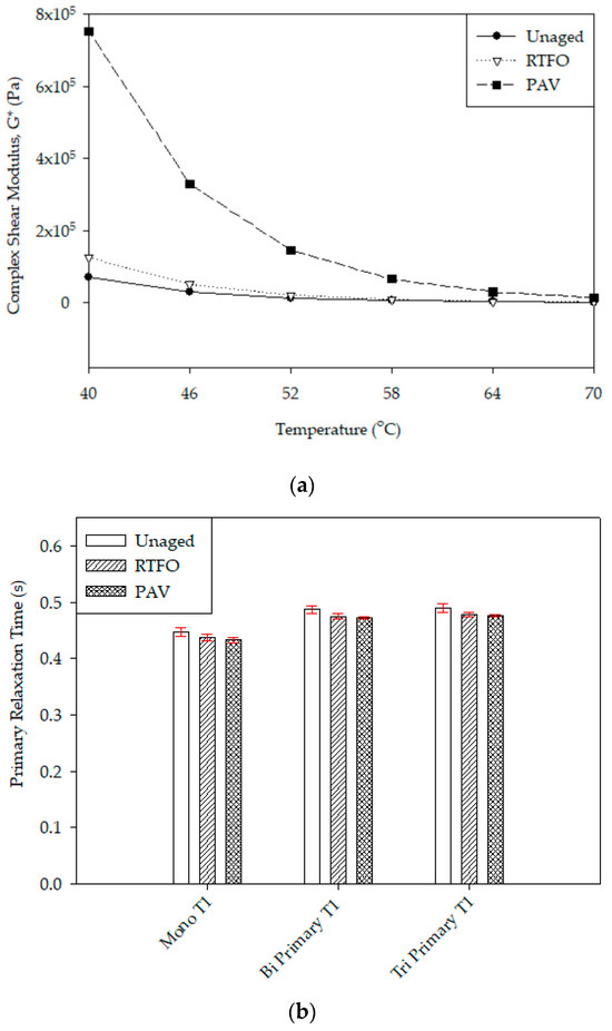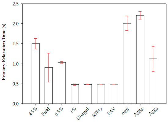 Asphalt binder was expected to have the highest density of hydrogen environments in the mixture. For comparison, laboratory-modeled binders were tested and compared. In a previous study, stiffer binders had longer relaxation times and/or more hydrogen environments [33]. In this study, the stiffnesses of the binders were different as shown in Figure 4a but their hydrogen environments were very similar, as displayed in Figure 4b. While the binder may be stiffer, the chemical structure still contains complex hydrocarbons as described by NMR. While these structures may interact differently to cause an increase in stiffness, the hydrogen environments are similar. The binders could not be differentiated using a mono-, bi-, or tri-exponential fit due to the overlapping of standard deviations as seen in Figure 4b. While other environments could have formed, the relaxation times of the RTFO and PAV-aged samples were very similar despite having different viscoelastic properties. The major pattern detected between these asphalt binder samples was the standard deviation; as the samples were aged, the sample variability decreased.