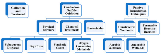 Acid mine drainage (AMD), a significant environmental issue that has garnered international attention, is characterized by elevated concentrations of metal ions, such as iron, zinc, copper, nickel, arsenic, and cadmium, in mine drainage. This contamination can have detrimental effects on rivers and the surrounding ecosystem. Although remediating polluted water of near-neutral drainage globally requires more extensive efforts, AMD is recognized as one of the major issues to be addressed for mine closure. AMD is considered a long-term problem due to the complex geochemical processes in generating acidic water, making it challenging to halt the reactions once they have commenced. AMD is estimated to persist for hundreds or thousands of years [1,2]. In Japan, AMD generation from closed mines persists and is estimated to last more than one hundred years [3]. The three primary approaches to addressing AMD issues are collection and treatment, control of sulfide oxidation, and passive remediation techniques, as shown in Figure 1 [4,5,6,7]. AMD generated from closed mines is mainly treated through collection and treatment by adding neutralizing agents to the wastewater. However, collection and treatment methods are not economically viable because they require continuous management and maintenance. Therefore, AMD source control, such as sulfide oxidation, is necessary at the early stages of mine development and as part of long-term management after mine closure. AMD is generated in mines from waste rock dumps, tailings dams, and open-pit and underground mine shafts. Due to the higher stripping ratio in open-pit mines, the volume of waste rock is significantly larger, rendering waste rock dumps a primary source of AMD. AMD prevention encompasses various approaches that are primarily aimed at minimizing contributing factors. These factors include oxygen supply, water infiltration and leaching, sulfide mineral availability, and bacteria (associated with biogeochemical processes). Furthermore, prevention methods may involve maximizing the availability of acid-neutralizing minerals or increasing the pH of infiltrated water [8].