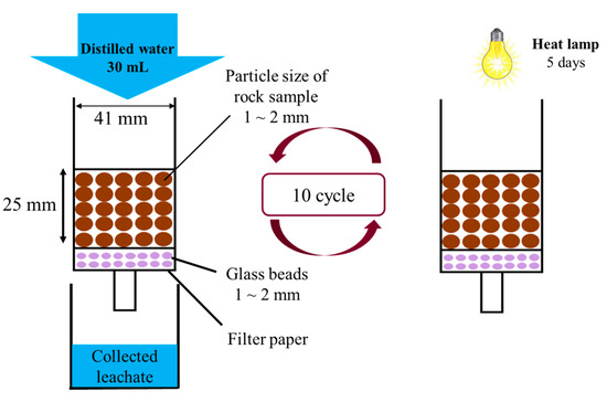 The concept of the column leaching test is illustrated in Figure 2. Columns with a diameter of 41 mm and height of 80 mm were utilized in the column leaching experiment. This column was equipped with filter paper and glass beads positioned at the base of the sample. Six columns were established with a blending layer of waste rocks, and three control columns were used. The particle size diameters of the samples ranged from 1 mm to 2 mm. Each column was filled with 30 mL of deionized water from the top. The leachate accumulated near the base of the column. After the water flow, the columns underwent a drying procedure in the laboratory, simulating the climate of near-equatorial sites. This procedure involved exposing them to light for 6 h daily for 5 days. The aforementioned process was repeated for 10 cycles. The water collected in each cycle was analyzed for pH, major anions, and cations after passing through 0.45 µm filters using Ion Chromatography (930 Compact IC Flex; Metrohm).