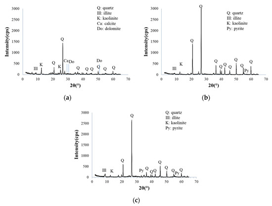 Figure 3a–c present the XRD analysis results. X-ray diffraction analysis confirmed the presence of quartz (SiO2), illite (K0.6Al12(Si,Al)4O10(OH)2 nH2O), and kaolinite (Al2Si2O5(OH)4) in all rock samples. Calcite and dolomite were identified as carbonate minerals in WRD-1. Conversely, pyrite was detected as a sulfide mineral in WRD-2 and WRD-3. Based on the XRD analysis, pyrite, dolomite, and calcite play significant roles in the rapid dissolution process. This is attributed to the low reactivity of quartz, illite, and kaolinite. The results of XRF analysis for the major elements are presented in Table 1. The analysis revealed that the materials exhibited substantial enrichment in silica (SiO2), alumina (Al2O3), iron oxide (FeO), K2O, MgO, CaO, and sulfur. It was also observed that WRD-1 contained a considerably higher quantity of alkali components. Furthermore, the sulfur content of WRD-3 was elevated (1.64%).