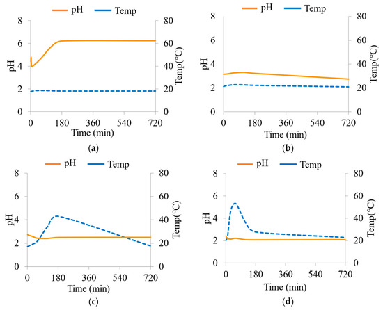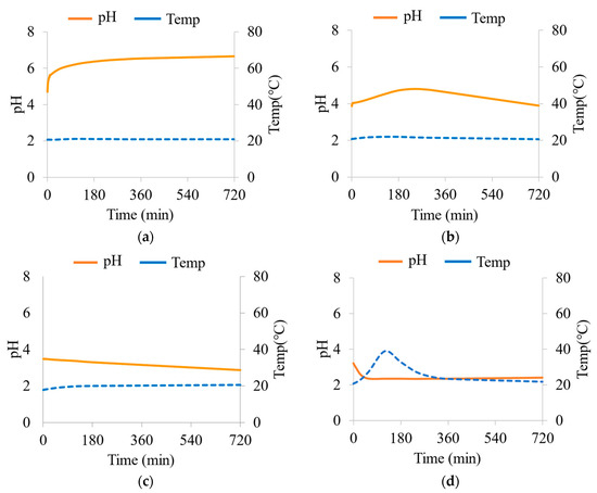 Figure 4 and Figure 5 illustrate the results of the kinetic NAG test, demonstrating the variations in pH and temperature over time. The findings indicate that the initial pH and the pH after 720 min decreased as the mixture ratio of WRD-2 and WRD-3 increased. This phenomenon can be attributed to the insufficient acid-neutralizing reactions with carbonate mineral dissolution compared to the acid-producing reaction with sulfide oxidation. During the kinetic NAG test, the pH exhibited a consistent upward trend, ultimately approaching a neutral value when the NAPP was negative (−1.9 kg H2SO4/ton), as depicted in Figure 4a. This observation suggests that the carbonate minerals possess a greater capacity to neutralize acid than the acid generated by the oxidation reaction of sulfide minerals. Consequently, blending waste rock with sufficient acid-neutralizing capacity may prevent acidic water generation. As shown in Figure 4a–c, no significant temperature changes were observed. However, for WRD-2 = 100% (Figure 4d), the pH rapidly became acidic at the onset of the experiment, accompanied by a temperature increase due to the oxidation of sulfide minerals. This result indicates that temperature changes can be observed when substantial oxidation reactions with sulfide minerals occur.
