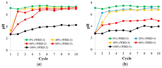 Figure 6a,b illustrate the pH results of the column leaching tests. Low pH was observed during the initial leaching test when PAF material was blended. These occurrences were attributed to the initial conditions of materials exposed to the atmosphere and humidity, resulting in the oxidation of sulfide minerals. The WRD-1 sample (WRD-2 and WRD-3 = 0%) exhibited a neutral pH throughout the experiment, whereas the 100% WRD-2 and WRD-3 samples demonstrated acidic conditions at pH = 4, even after 10 cycles. As depicted in Figure 6a, the pH decreased with an increased blending ratio of WRD-2. However, the pH approached neutrality after 10 cycles, although the duration required for the pH to increase varied. Alterations potentially influence these conditions in the column’s geochemical reactions of carbonate minerals. The availability of neutralizing minerals such as calcite (CaCO3) and dolomite (CaMg(CO3)2) influenced the oxidation mechanism and water quality. Neutralization reactions occurred due to acidity: i.e., calcite and dolomite dissolved due to decreased pH. Previous research has observed a similar tendency, although the study examined a multi-layering system [42]. The remediation of pH was slower when the blending ratio of WRD-2 was larger. This can be attributed to the time required for the acid-neutralizing reaction to overcome the acid generation caused by the oxidation of sulfide minerals. Figure 6b demonstrates a gradual decrease in pH with an increase in the blending ratio of WRD-3. The pH was also lower than that of the sample blended with WRD-2; specifically, the pH of the leachate remained acidic throughout the experiment when WRD-3 was blended at 60%. This is attributed to the higher sulfur content in the WRD-3 sample, resulting in more frequent sulfide oxidation than the WRD-2 sample.