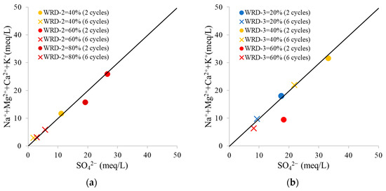 Figure 7a,b show the oxidation–neutralization curve plotted with SO42− and the sum of Ca2+, Mg2+, Na+, and K+ in meq/L (charge of ions) [43]. This curve represents the geochemical evolution of the acid to neutralize the element-produced ratios [44,45], indicating that the acid-neutralizing reaction is in equilibrium with the acid-producing reaction if the plot is close to the 1:1 line. In the analysis of the leachate from cycles 2 and 6, as presented in Figure 7a, the WRD-2 = 40% and WRD-2 = 60% samples exhibit a balanced composition of cations (Na+ + Mg2+ + Ca2+ + K+) and SO42−, irrespective of the cycle. However, in the WRD-2 = 80% sample, the quantity of SO42− eluted exceeded that of cations in cycle 2, although SO42− and cation concentrations were equilibrated in cycle 6 when the pH was neutral. Notably, the NAPP value at WRD-2 = 80% was 11.3 kg H2SO4/ton, higher than those of the other samples. Consequently, the acid-neutralizing reaction rate was delayed for the blended sample with positive NAPP. Blended samples with negative and slightly positive NAPP (WRD-2 = 40% and 60%) demonstrated sufficient capacity to elevate the pH to neutral in the initial stage. This indicates that these samples possess a high acid-neutralizing capacity against acid generation.